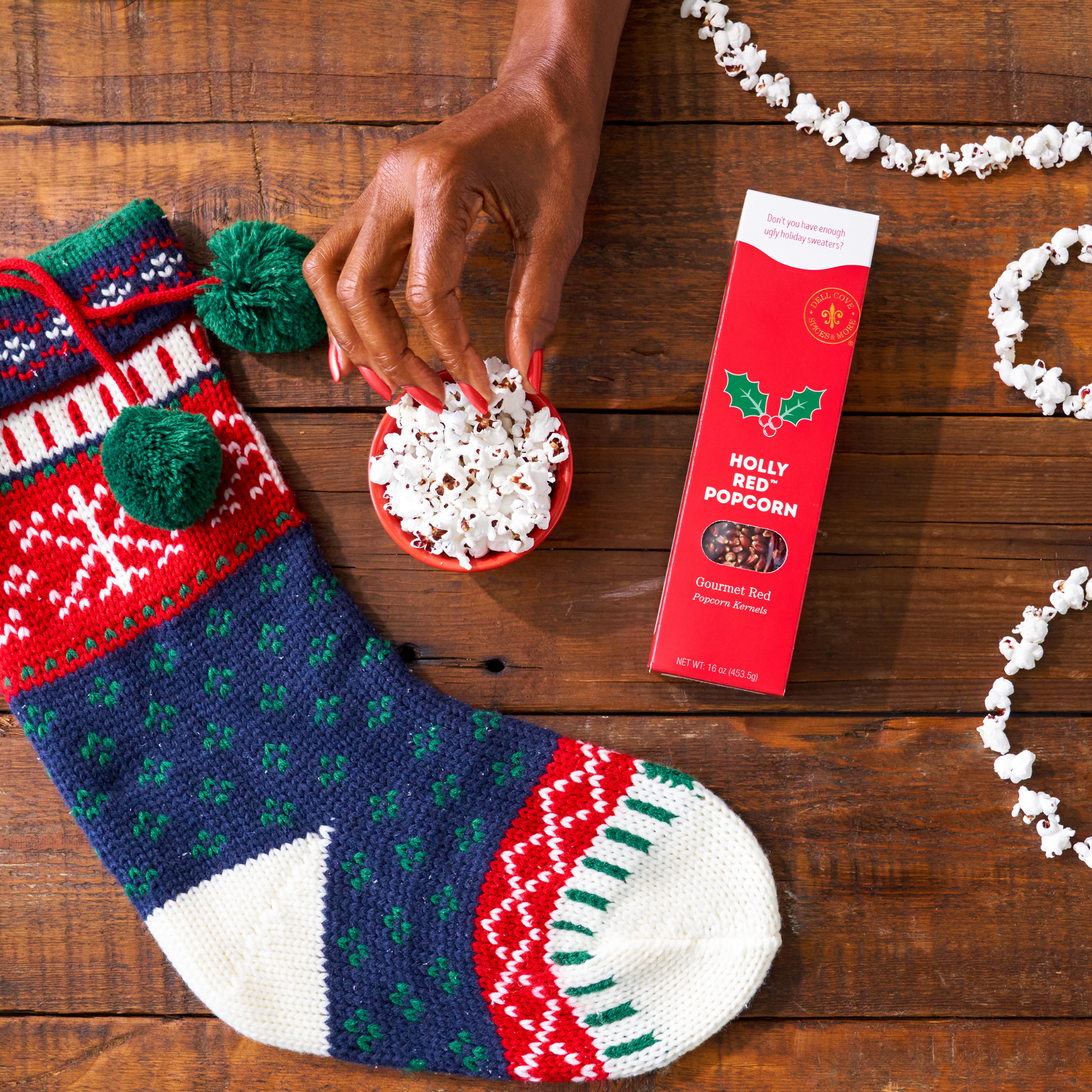 - Holly Red® Popcorn Kernels - red popcorn that pops up fluffy and crunchy, with very few flaky hulls and a slight red tint to the center.