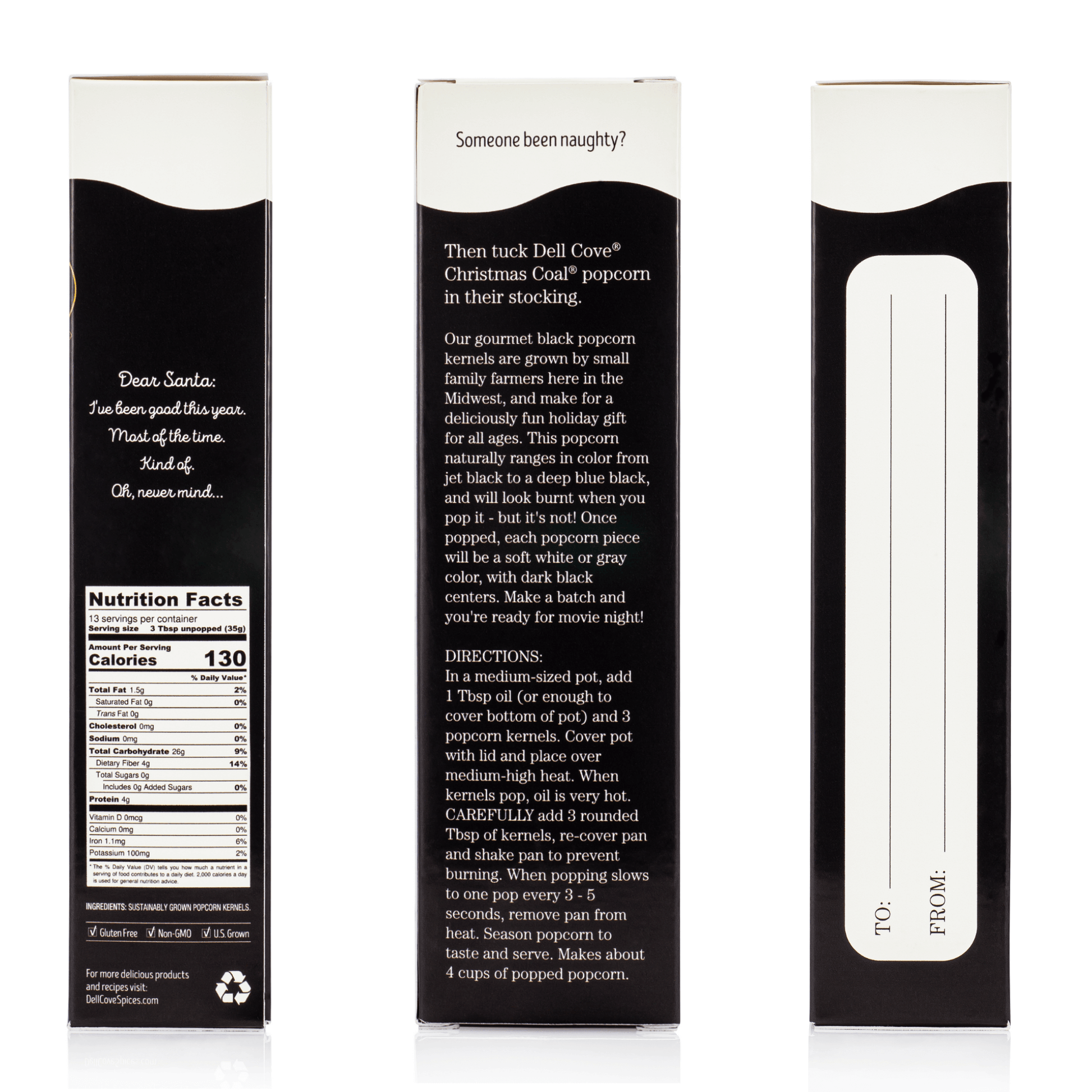 - Christmas Coal® Popcorn Kernels - black popcorn that look burnt when you pop them - but they're not!
