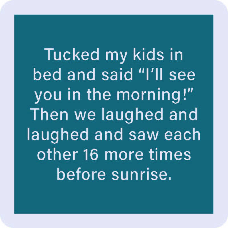 “Tucked my kids in bed and said ‘I’ll see you in the morning!’ Then we laughed and laughed and saw each other 16 more times before sunrise.”