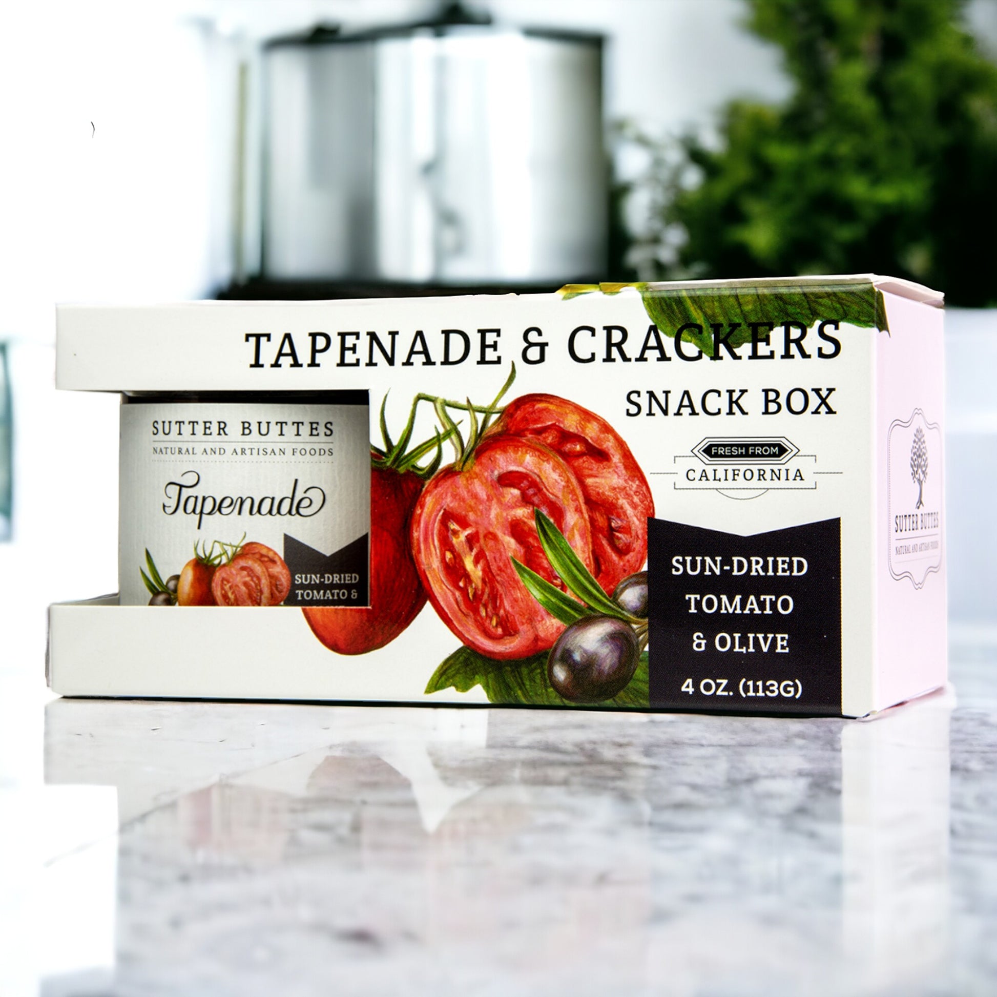 Box includes a 4 oz Sun-Dried Tomato Tapenade, crackers, and a little spoon.