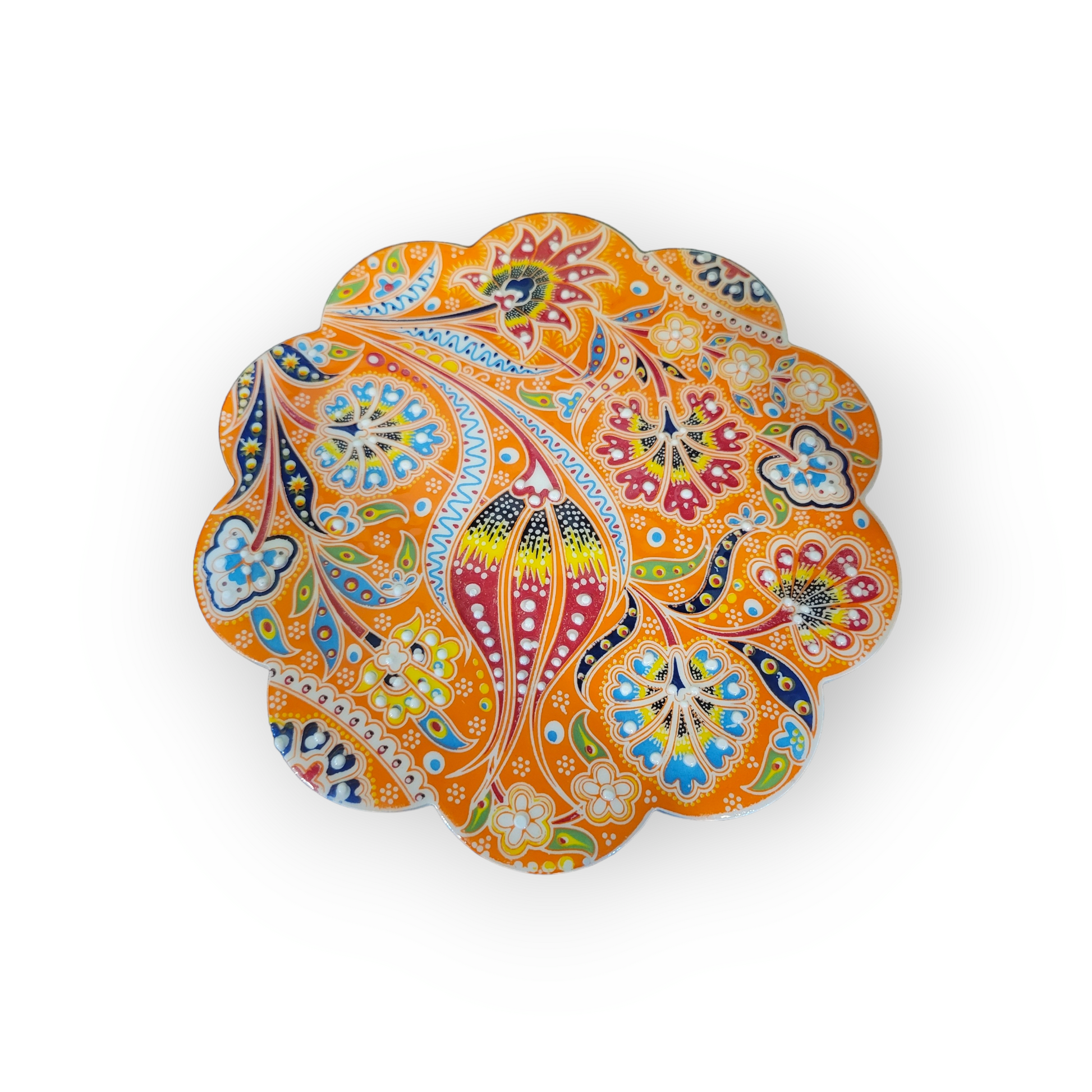 Our handmade ceramic pieces are the perfect pop of color for your home. You can display this plate as a piece of art on a plate stand or on the wall. You can also use it as an eye catching centerpiece at your next dinner party since they are food safe. We use vivid and eclectic colors with our famous embossed technique to bring a 3D relief to the surface of the plate.