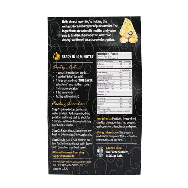 Hello cheese lover! You’re holding the contents for a velvety pot of pure comfort. The ingredients are naturally healthy and you’re sure to find the cheddar grate. What? Too cheesy? We’ll work on a sharper description.