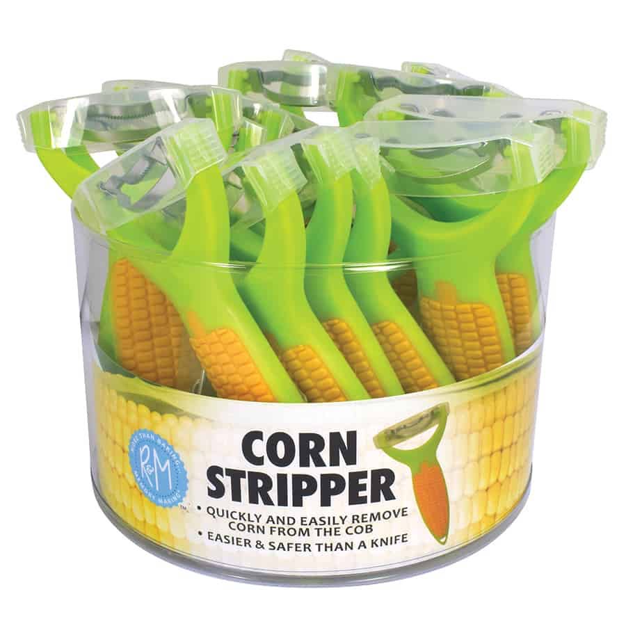Quickly remove corn from the cob with our Corn Stripper. Saves time with a sharp blade and comfortable handle. Pull Corn Stripper along corn lengthwise while gently pressing down and away from hand holding the corn. For best results use horizontally on a flat surface. Easier and safer than a knife! Hand wash in warm soapy water, dry thoroughly before and after each use. Plastic & Stainless steel. 7″L. 24 pcs per bucket.
